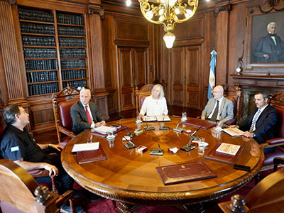 El presidente de la Suprema Corte de Justicia, Sergio Torres, junto a los ministros Daniel Fernando Soria e Hilda Kogan, recibieron y mantuvieron un encuentro con el Ministro de Seguridad de la Provincia, Javier Alonso.