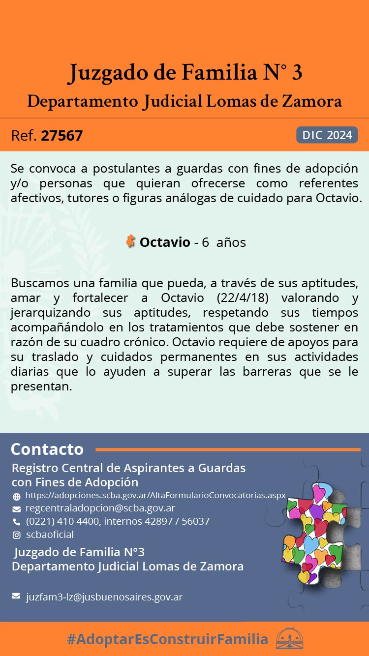 El Juzgado de Familia Nº3 del Departamento Judicial de Lomas de Zamora, sito en calle Azara Nº1648, Piso 1; Banfield y el Registro Central de Aspirantes a Guarda con Fines de Adopción, convocan a postulantes a guardas con fines de adopción y/o personas que quieran ofrecerse como referentes afectivos, tutores o figuras análogas de cuidado Octavio nacido el día 22 de abril de 2018, de 6 años de edad.