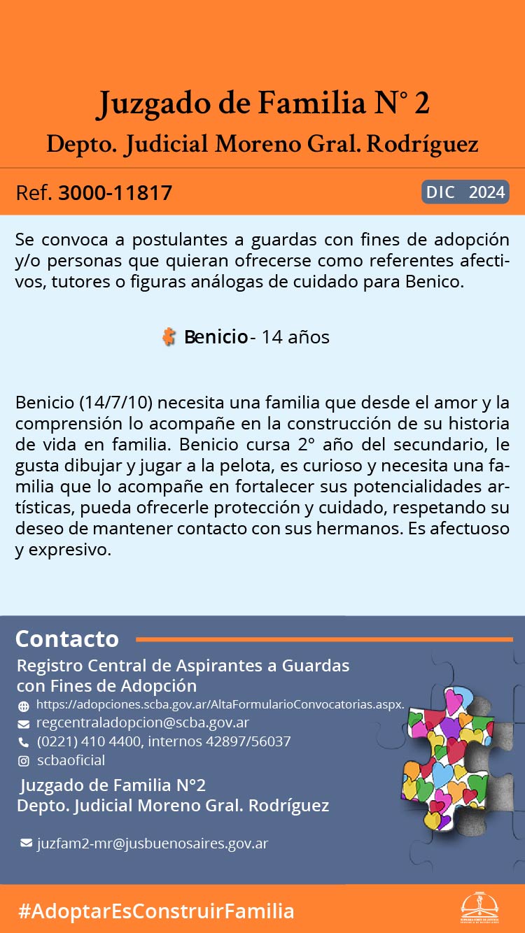 El Juzgado de Familia Nº2 del Departamento Judicial Moreno Gral Rodriguez y el Registro Central de Aspirantes a Guarda con Fines de Adopción convocan a postulantes a guardas con fines de adopción y personas que quieran ofrecerse como referentes afectivos, tutores o figuras análogas de cuidado para Benicio, de 14 años de edad, nacido el día 14 de julio de 2010.
