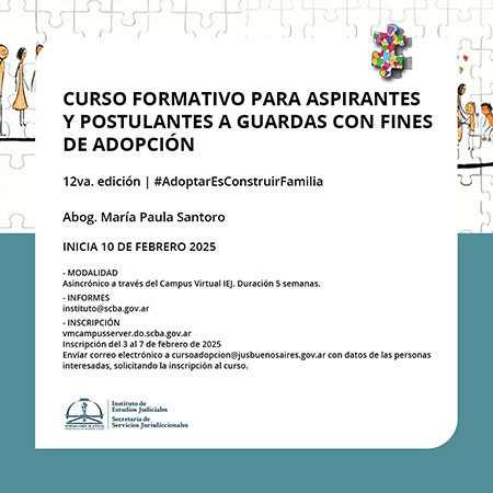 Asimismo, el 10 de febrero comienza la 12va. edición del Curso formativo para aspirantes y postulantes a guarda con fines de adopción. El mismo se realizará a través del Campus Virtual del IEJ de forma asincrónica y tendrá una duración de 5 semanas. Para participar, los interesados deben remitir un correo electrónico a la