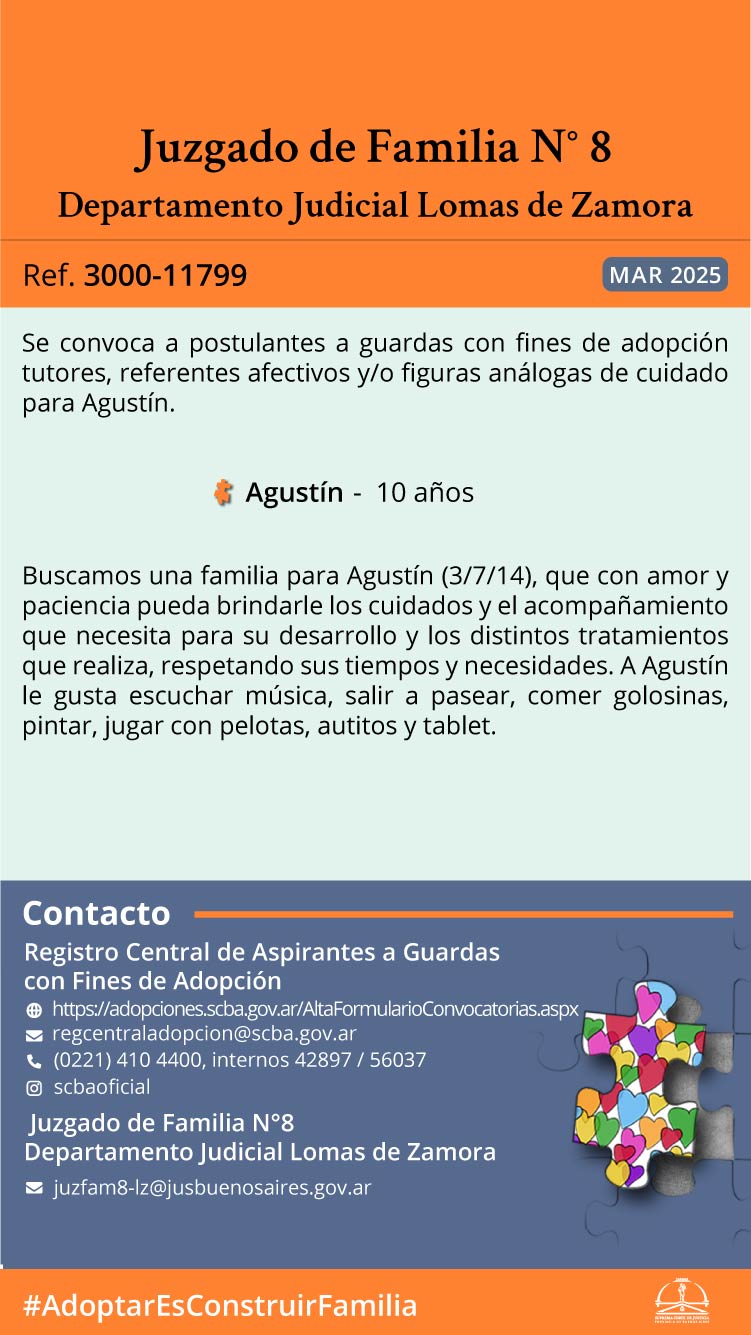El Juzgado de Familia Nro.8 del Departamento Judicial Lomas de Zamora y el Registro Central de Aspirantes a Guarda con Fines de Adopción convocan a postulantes a guarda con fines de adopción y/o personas que quieran ofrecerse como referentes afectivos, tutores o figuras análogas de cuidado acorde a las necesidades de Agustín, de 10 años de edad, nacida 3 de julio de 2014.