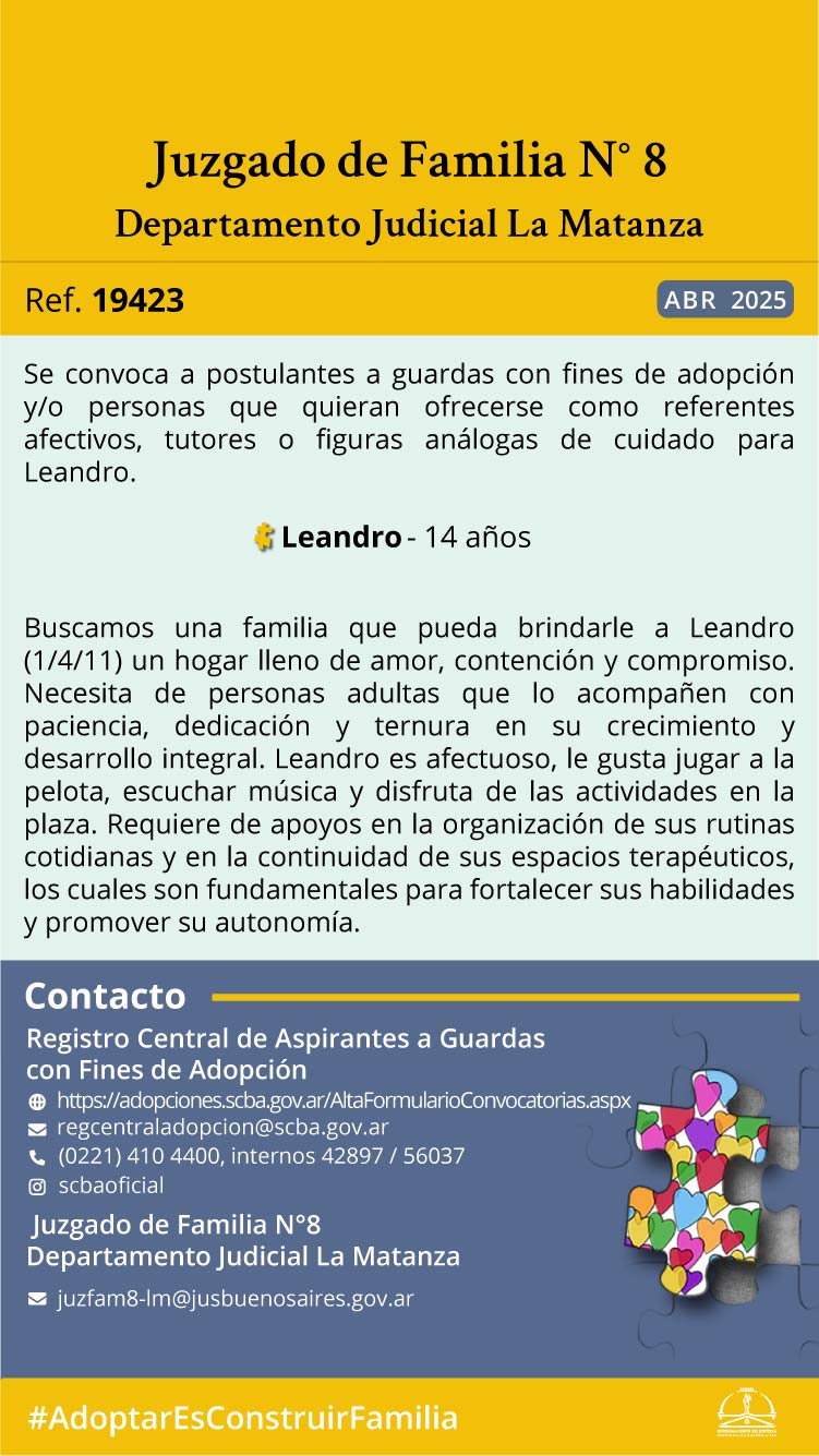 El Juzgado de Familia Nº8 del Departamento Judicial La Matanza y el Registro Central de Aspirantes a Guarda con Fines de Adopción, convocan a aspirantes a guardas con fines de adopción y/o personas que quieran ofrecerse como referentes afectivos, tutores o figuras análogas de cuidado para Leandro de 14 años, años, nacido el día 1 de abril de 2011.