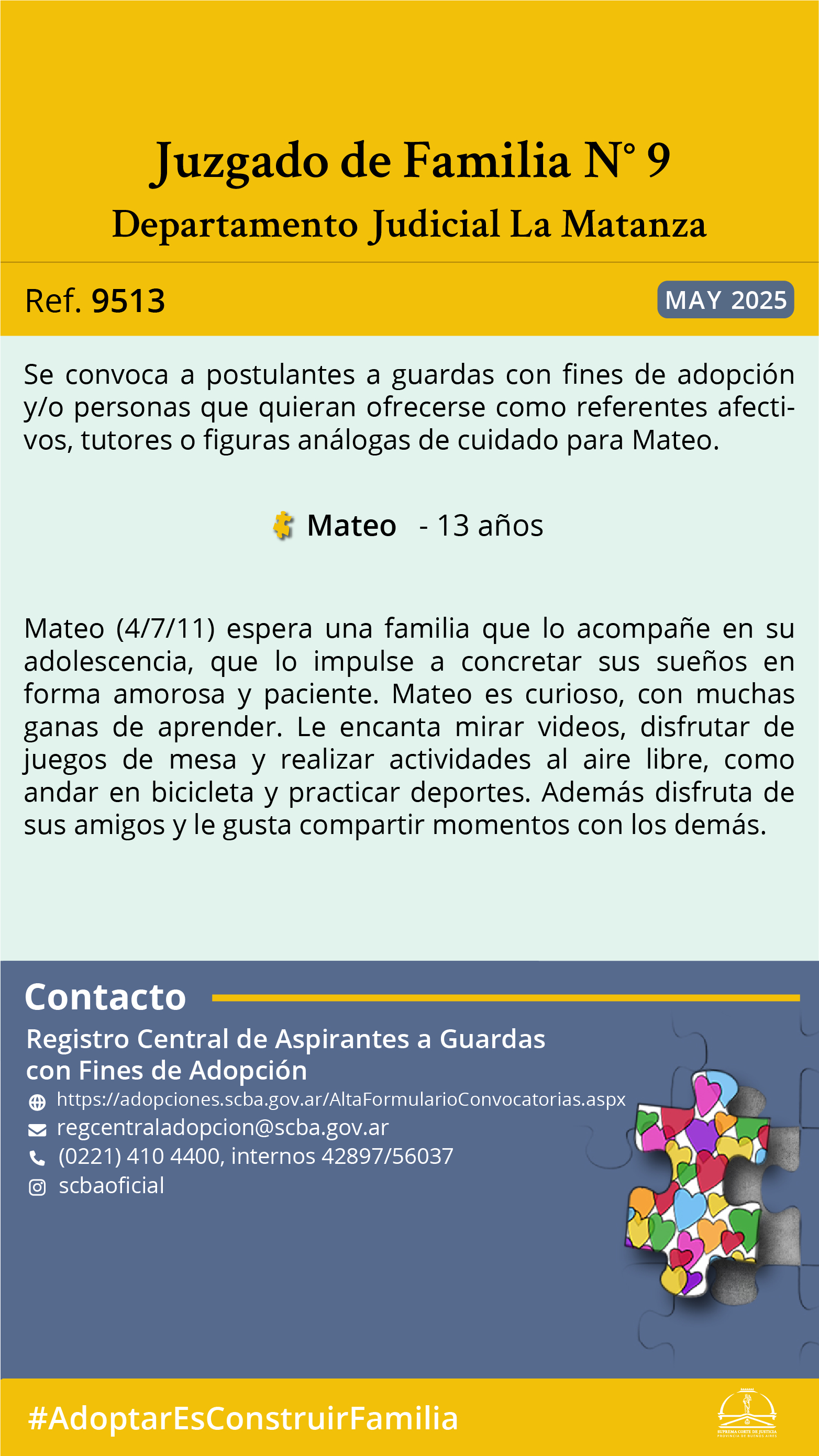 El Juzgado de Familia Nro9 del Departamento Judicial La Matanza y el Registro Central de Aspirantes a Guarda con Fines de Adopción, convocan a postulantes a guardas con fines de adopción y/o personas que quieran ofrecerse como referentes afectivos, tutores o figuras análogas de cuidado para Mateo, de 13 años de edad, nacido el día 4 de julio de 2011.