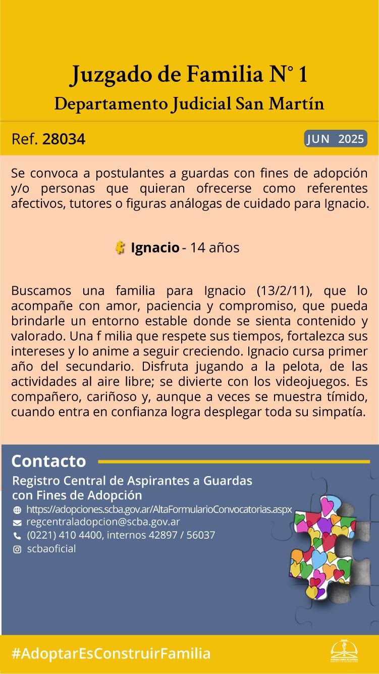 El Juzgado de Familia nº1 del Departamento Judicial General San Martín y el Registro Central de Aspirantes a Guarda con Fines de Adopción, convocan a postulantes a guardas con fines de adopción y/o personas que quieran ofrecerse como referentes para Ignacio de 14 años de edad, nacido el día 13 de febrero de 2011.