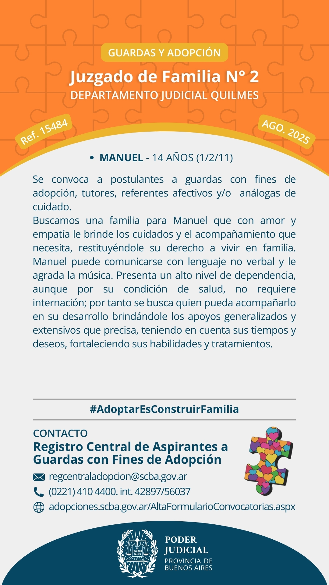 El Juzgado de Familia nº 2 del Departamento Judicial Quilmes y el Registro Central de Aspirantes a Guarda con Fines de Adopción convocan a postulantes a guarda con fines de adopción y/o personas que quieran ofrecerse como referentes afectivos, tutores o figuras análogas de cuidado para Manuel, de 14 años, nacido/a el día 1 de febrero de 2011.