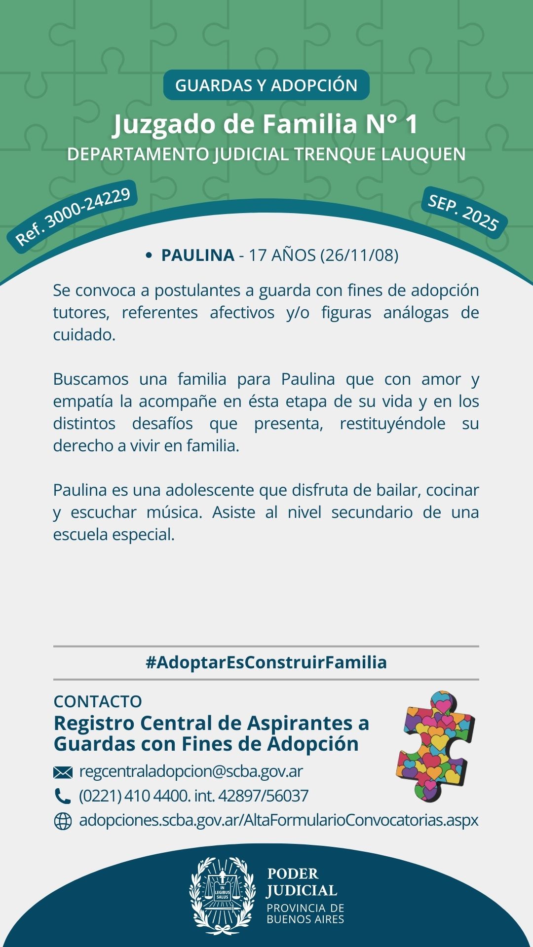 El Juzgado de Familia nº1 de Pehuajó, Departamento Judicial Trenque Lauquen y el Registro Central de Aspirantes a Guarda con Fines de Adopción convocan a postulantes a guarda con fines de adopción y/o personas que quieran ofrecerse como referentes afectivos, tutores o figuras análogas de cuidado para Paulina, de 17 años, nacida el día 26 de noviembre de 2008.
