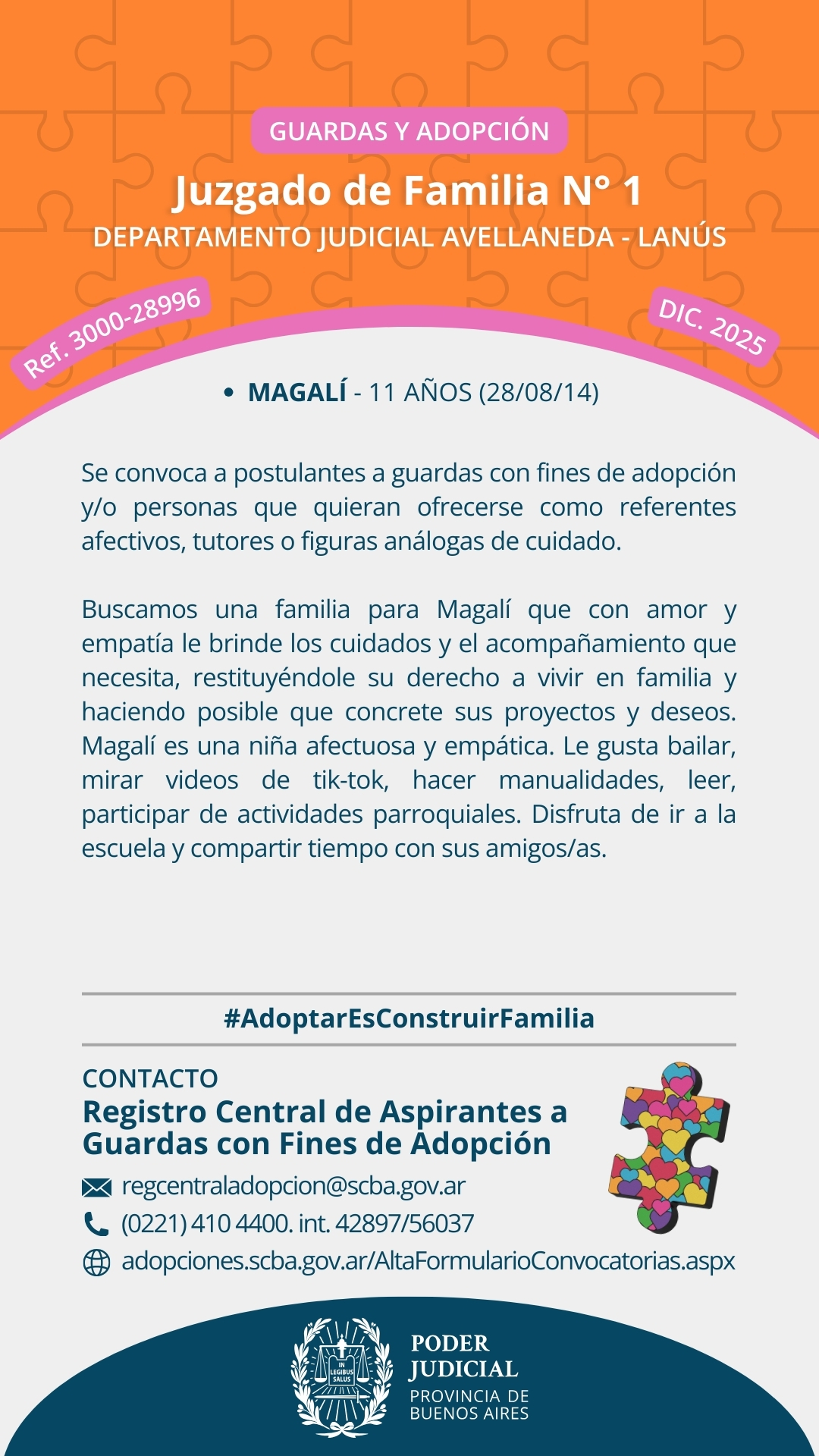 Cabe aclarar que el ofrecimiento e inscripción a una Convocatoria Pública, vale solo y exclusivamente para esa Convocatoria y esos/as niños, niñas o adolescentes en particular. Si las personas desean inscribirse para ser convocados por otros/as niños, niñas o adolescentes indeterminados/as en situación de adoptabilidad, deben inscribirse en el Registro Central de Aspirantes a Guardas con fines de Adopción por medio de este formulario.