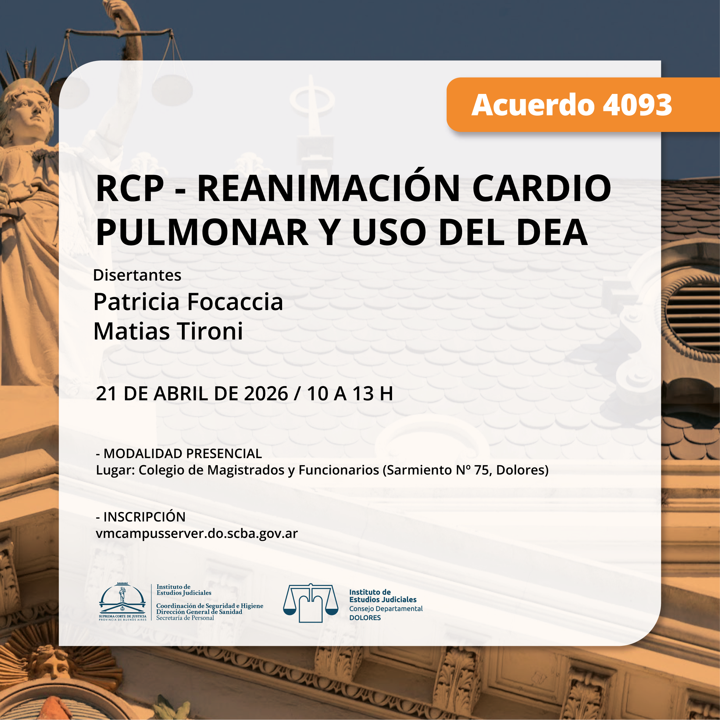 21 de abril, 5 de mayo, 20 de mayo y 2 de junio: presencial de 14.30 a 15.45 hs. en la Sede de la Unión de Magistrados y Funcionarios ( Av. 12 de Octubre Nº 1202, Lomas de Zamora)