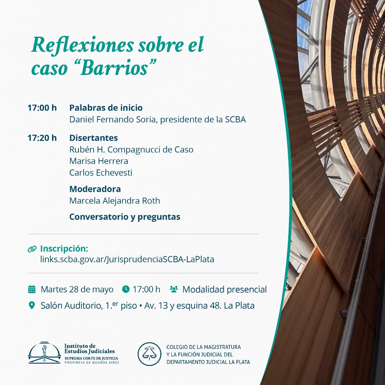 Salón Auditorio del Instituto de Estudios Judiciales, Avda. 13 esq. 48 primer piso La Plata