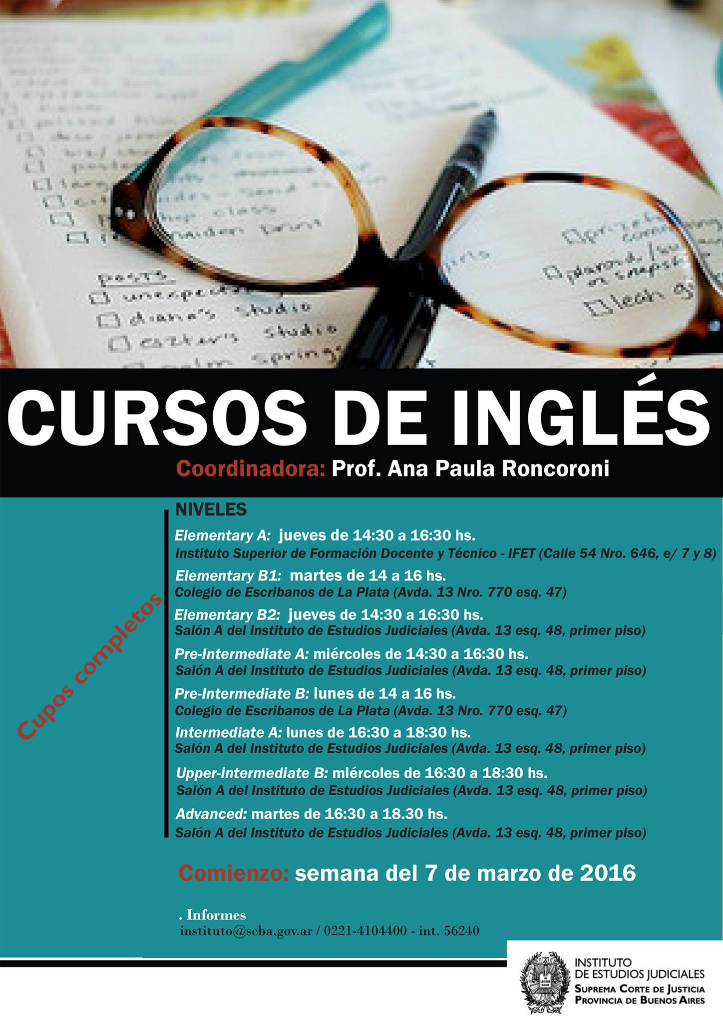 •ELEMENTARY B2 : jueves de 14.30 a 16.30 hs.Lugar: Salón A del Instituto de Estudios Judiciales, sito en Avda. 13 esq.48, primer piso.