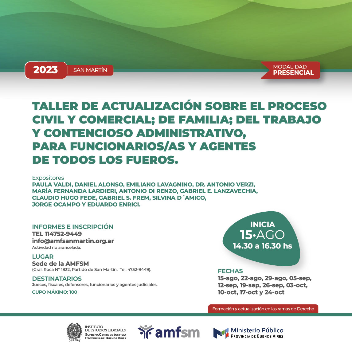 15-08-2023 | SAN MARTIN - Taller de actualización sobre el proceso civil y comercial; de familia; del trabajo y contencioso administrativo, para funcionarios/as y agentes de todos los fueros