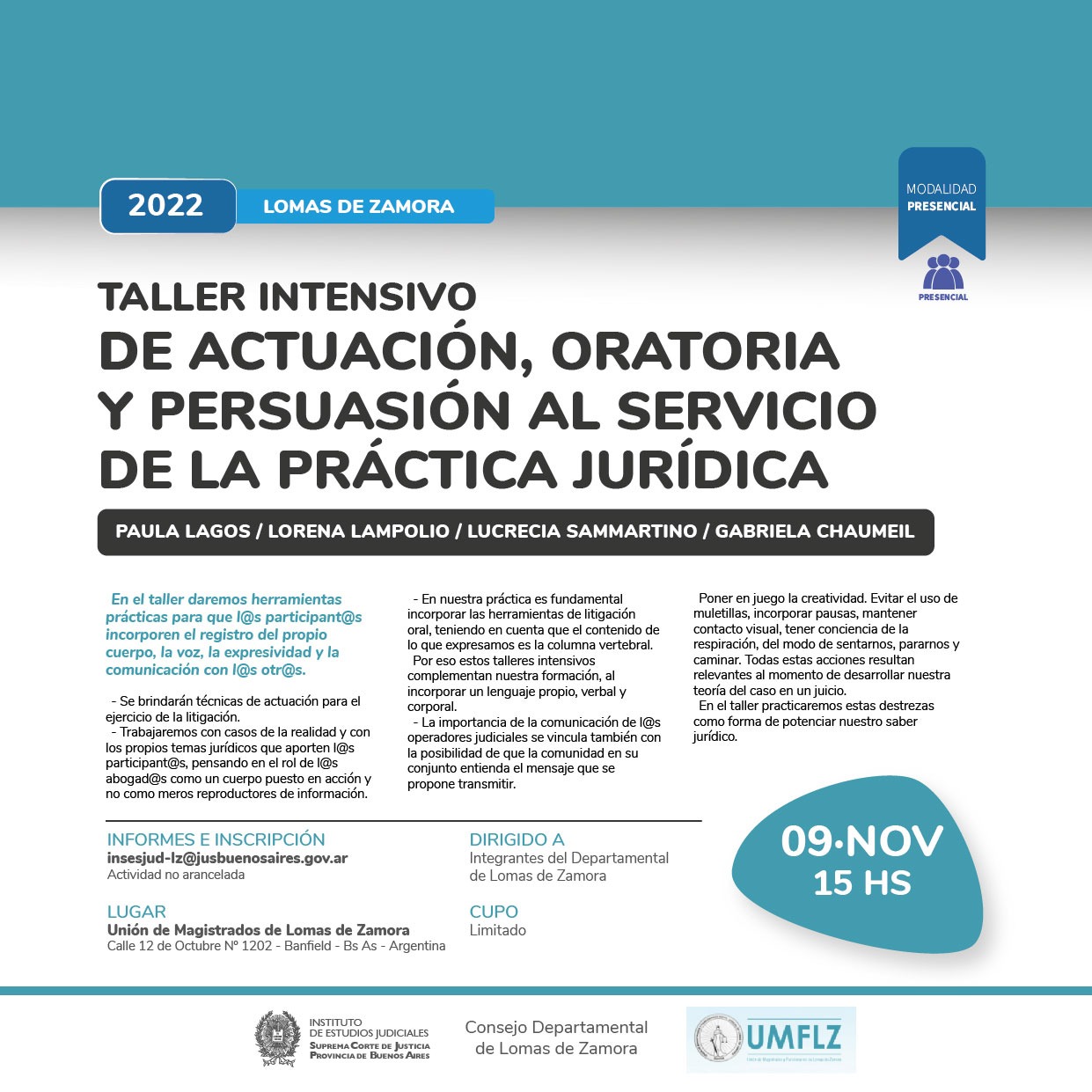 09-11-2022 | LOMAS DE ZAMORA - Taller intensivo de actuación, oratoria y persuasión al servicio de la práctica jurídica
