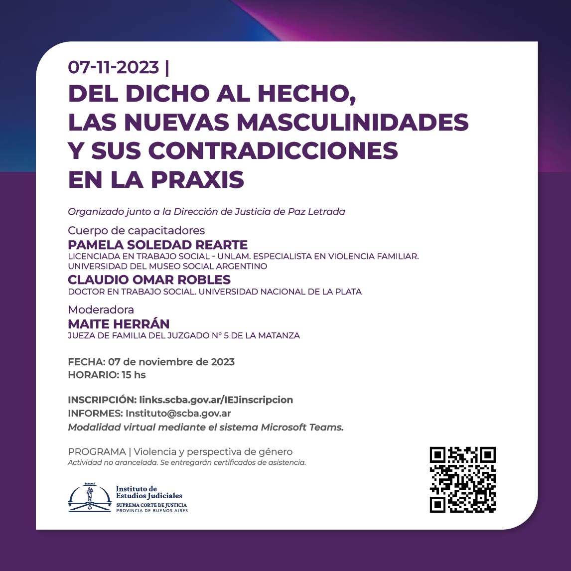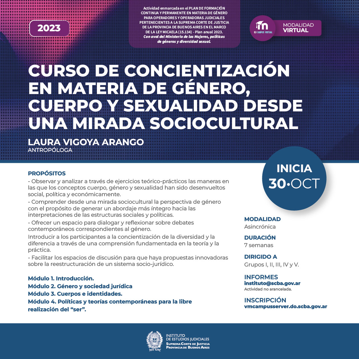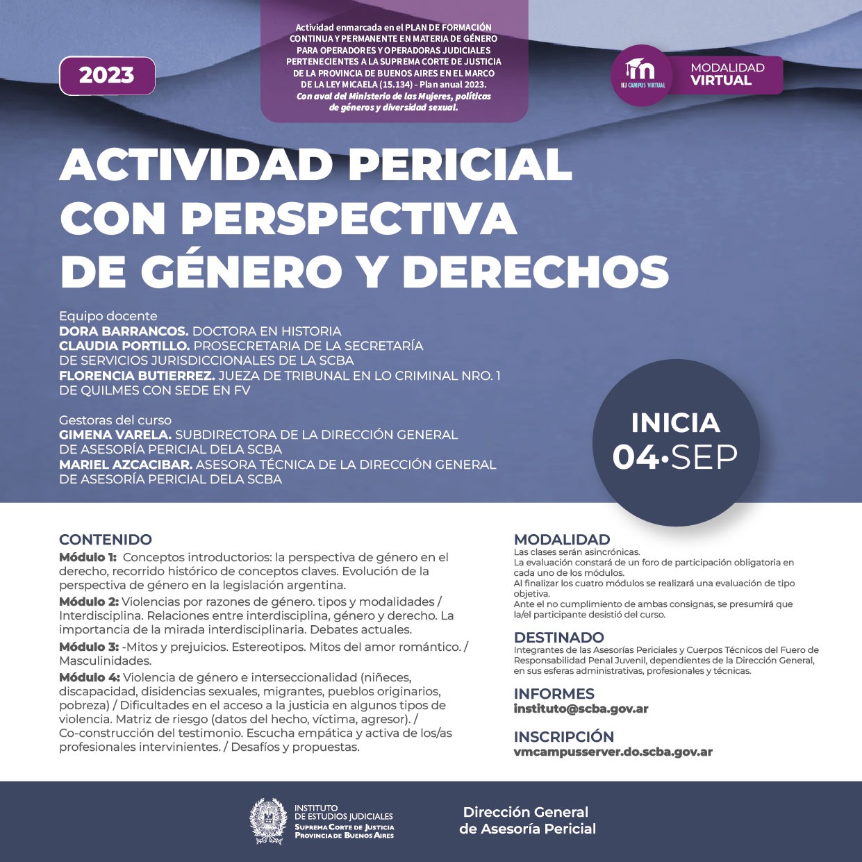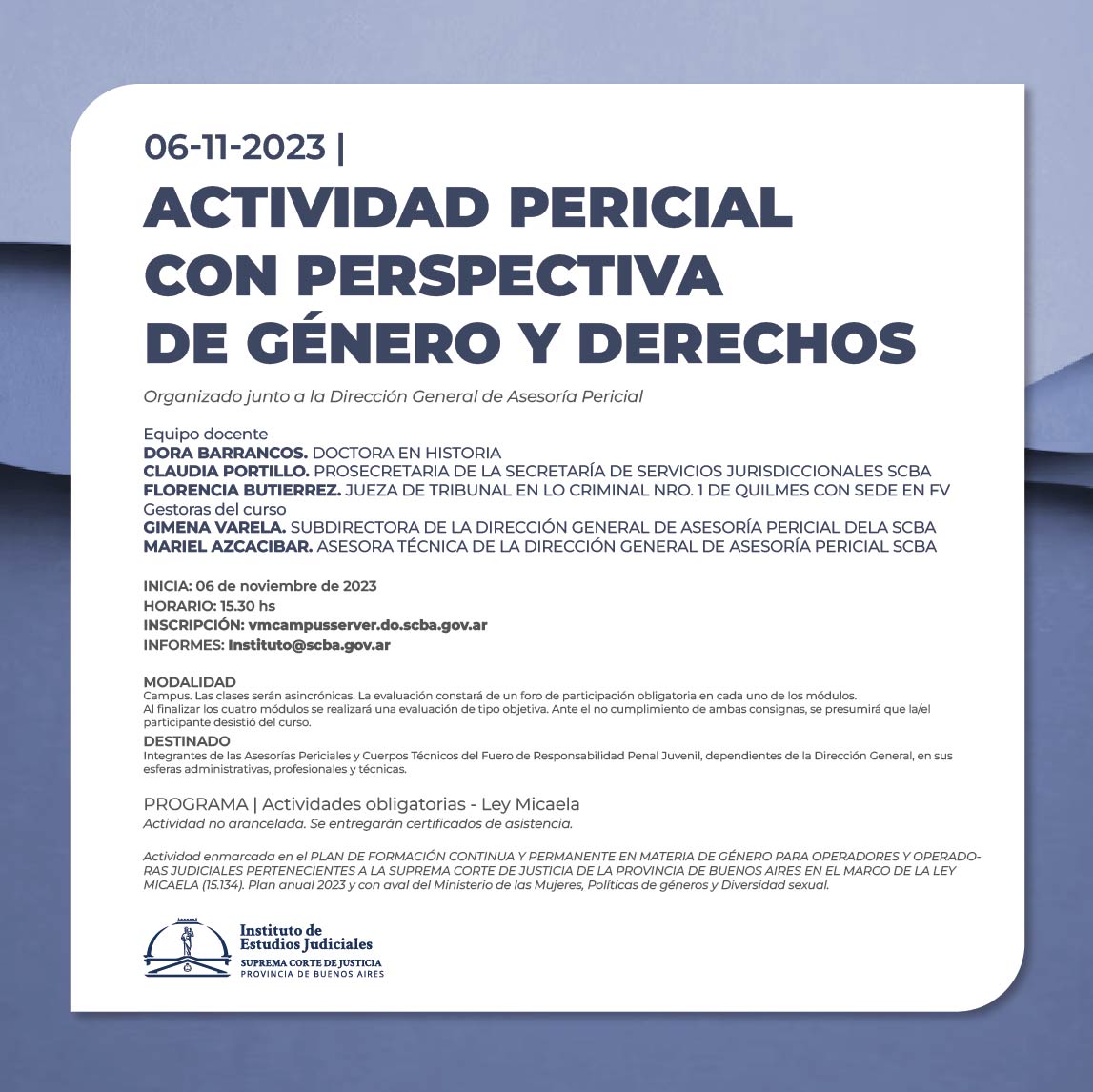 Actividad enmarcada en el PLAN DE FORMACIÓN CONTINUA Y PERMANENTE EN MATERIA DE GÉNERO PARA OPERADORES Y OPERADORAS JUDICIALES PERTENECIENTES A LA SUPREMA CORTE DE JUSTICIA DE LA PROVINCIA DE BUENOS AIRES EN EL MARCO DE LA LEY MICAELA (15.134) -Plan anual 2023 y con aval del Ministerio de las Mujeres, Políticas de géneros y Diversidad sexual