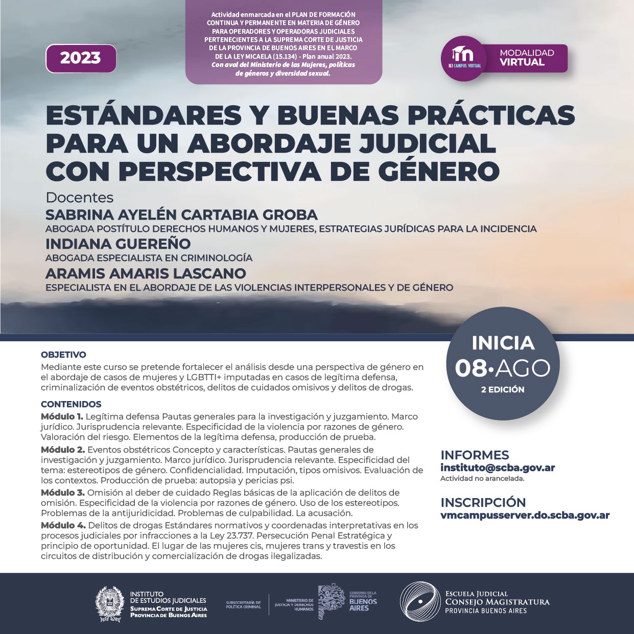 Actividad enmarcada en el PLAN DE FORMACIÓN CONTINUA Y PERMANENTE EN MATERIA DE GÉNERO PARA OPERADORES Y OPERADORAS JUDICIALES PERTENECIENTES A LA SUPREMA CORTE DE JUSTICIA DE LA PROVINCIA DE BUENOS AIRES EN EL MARCO DE LA LEY MICAELA (15.134) -Plan anual 2023 y con aval del Ministerio de las Mujeres, Políticas de géneros y Diversidad sexual