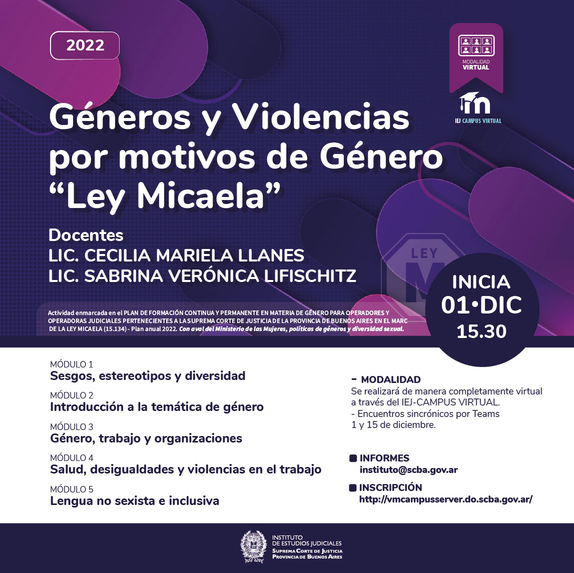 Actividad enmarcada en el PLAN DE FORMACIÓN CONTINUA Y PERMANENTE EN MATERIA DE GÉNERO PARA OPERADORES Y OPERADORAS JUDICIALES PERTENECIENTES A LA SUPREMA CORTE DE JUSTICIA DE LA PROVINCIA DE BUENOS AIRES EN EL MARCO DE LA LEY MICAELA (15.134) -Plan anual 2022- y con aval del Ministerio de las Mujeres, Políticas de géneros y Diversidad sexual
