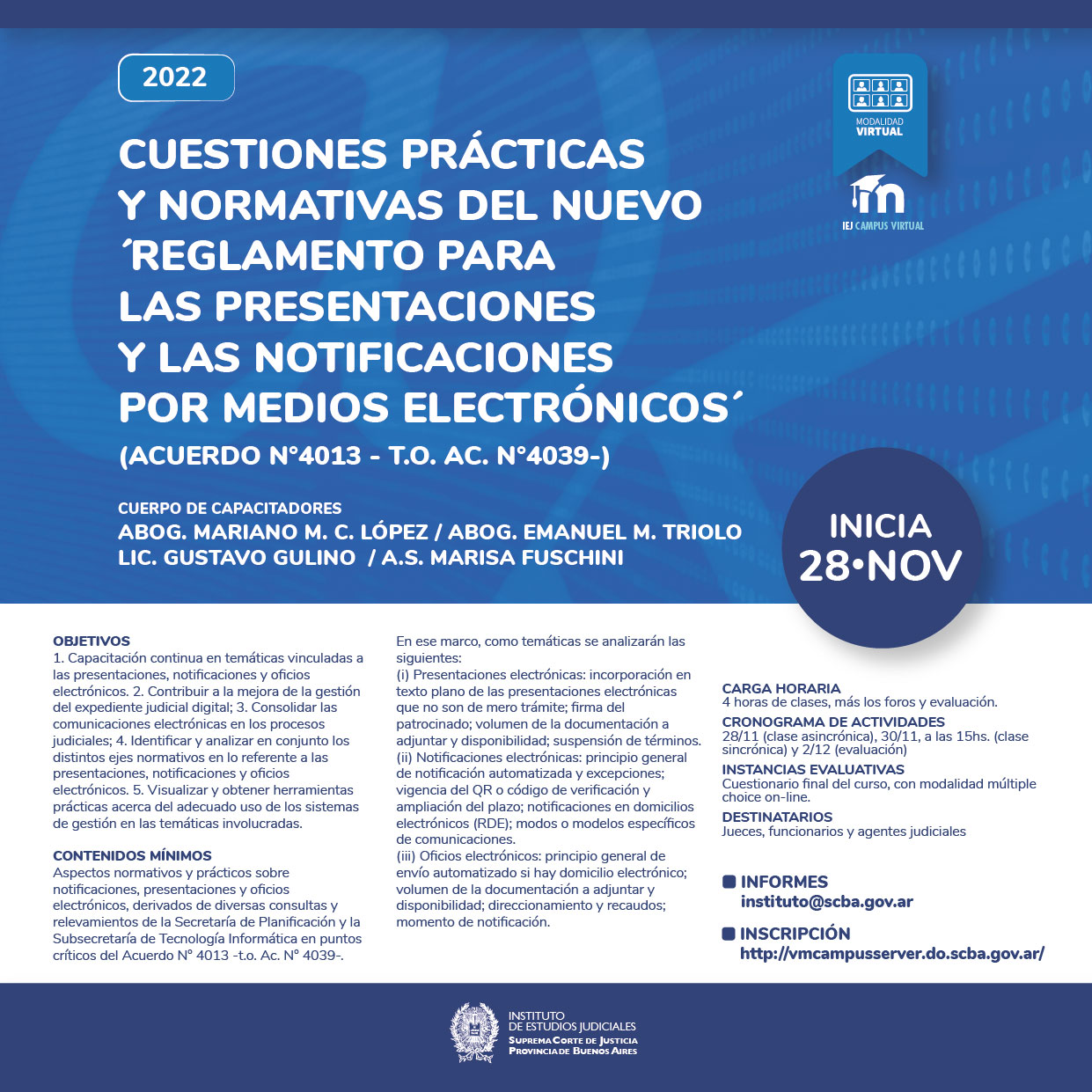 28-11-2022 | Cuestiones prácticas y normativas del nuevo ´Reglamento para las presentaciones y las notificaciones por medios electrónicos´ (Acuerdo Nº4013 -t.o. Ac. Nº4039-) ( a distancia )