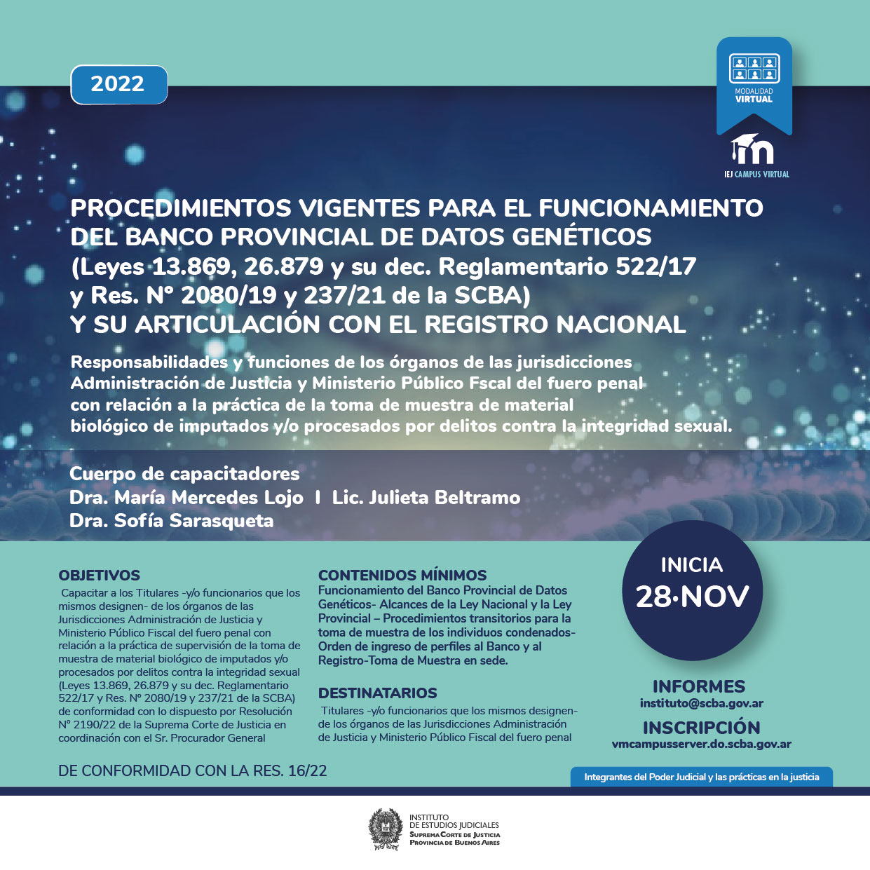 28-11-2022 | Procedimientos Vigentes para el Funcionamiento del Banco Provincial de Datos Genéticos ( Leyes 13.869 , 26.879 y dec. Reglamentario 522/17 y Res.Nro.2080/19 y 237/21 de la SCBA) y su Articulación con el Registro Nacional ( a distancia )