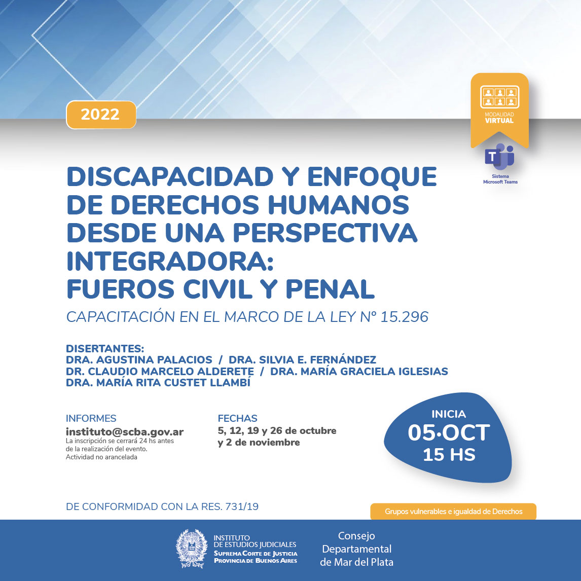 05-10-2022 | Discapacidad y enfoque de derechos humanos desde una perspectiva integradora: fueros civil y penal. Capacitación en el marco de la ley Nº 15.296 ( a distancia )