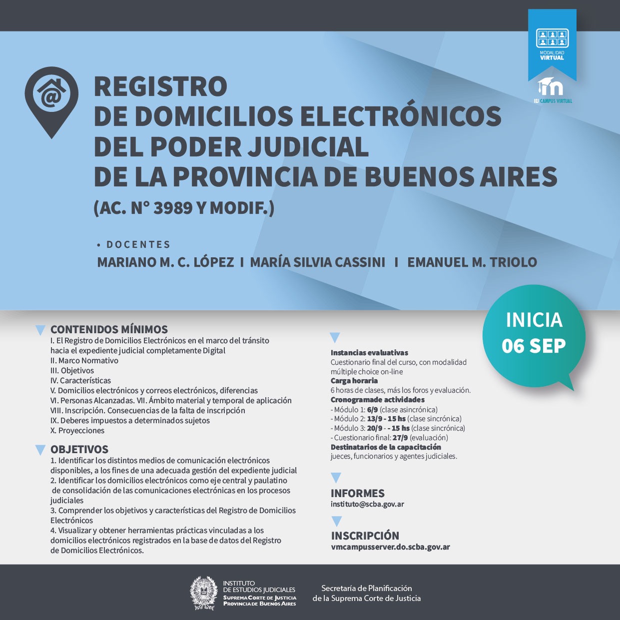 06-09-2021 | Registro de Domicilios Electrónicos del Poder Judicial de la Pcia. de Bs. As. (Ac. Nº 3989 y modif) ( a distancia )