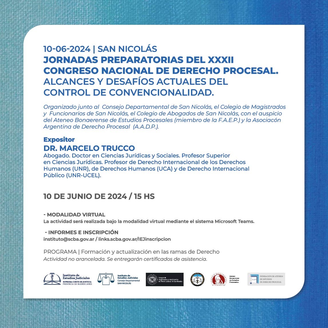 Organizado junto al Consejo Departamental de San Nicolás, el Colegio de Magistrados y Funcionarios de San Nicolás, el Colegio de Abogados de San Nicolás, con el auspicio del Ateneo Bonaerense de Estudios Procesales (miembro de la F.A.E.P.) y la Asociación Argentina de Derecho Procesal (A.A.D.P.).-