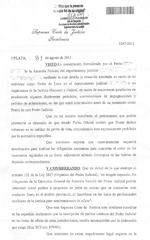 POR ELLO: el señor Presidente de la Suprema Corte de Justicia, en ejercicio de sus atribuciones, RESUELVE: 1.- Hacer saber al Perito ...... de la Asesoría Pericial del departamento judicial ...... que, por las razones expuestas en el exordio de la presente, deberá cesar en forma inmediata en su intervención como Perito de Lista en aquellos expedientes en trámite ante órganos de este Poder Judicial o de las Justicias Nacional o Federal. (ver resolución completa en archivos adjuntos)