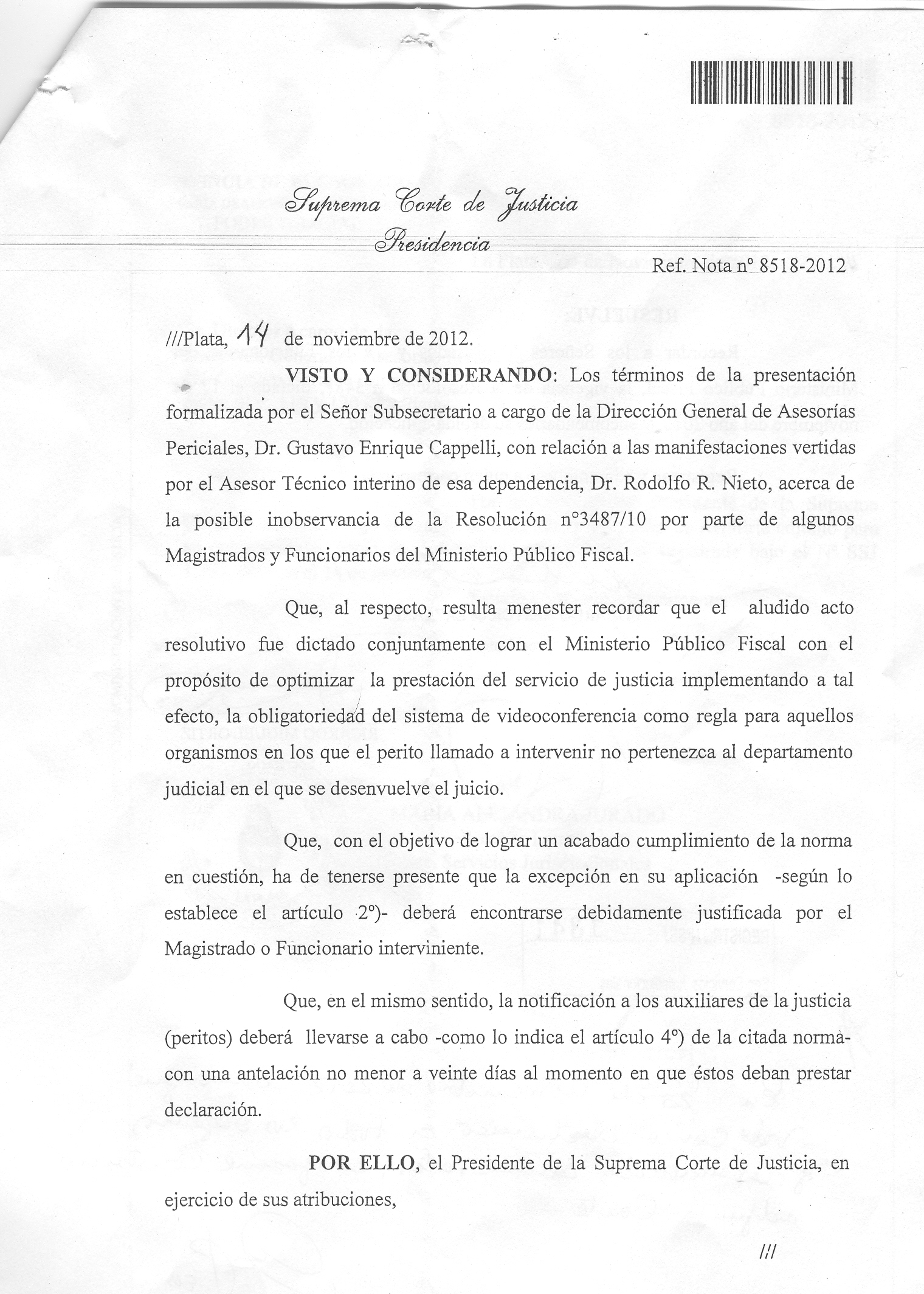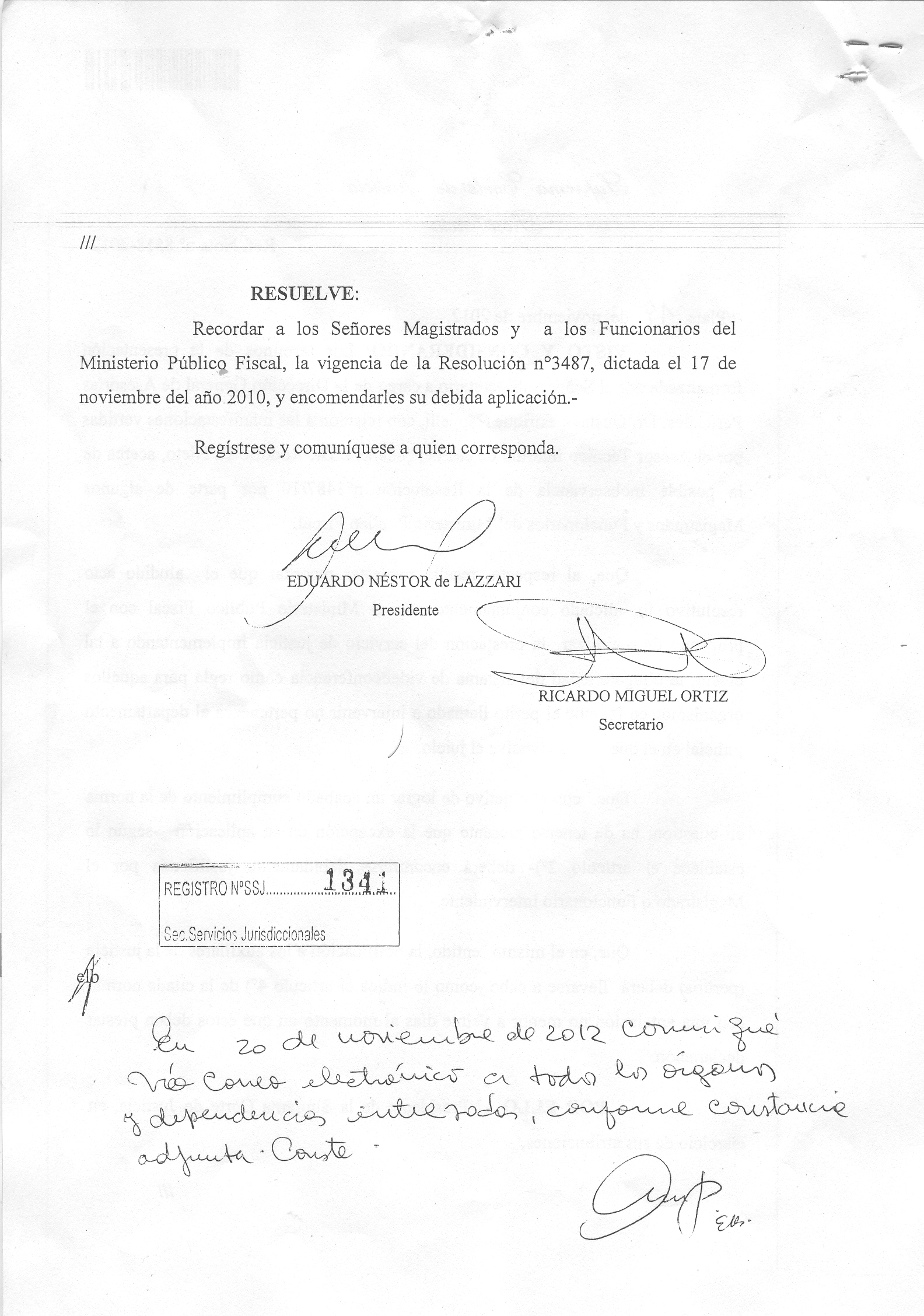 El Presidente de la Suprema Corte de Justicia, en ejercicio de sus atribuciones, Resuelve: Recordar a los Señores Magistrados y a los Funcionarios del Ministerio Público Fiscal, la vigencia de la Resolución nº 3487, dictada el 17 de noviembre del año 2010, y encomendarles su debida aplicación.