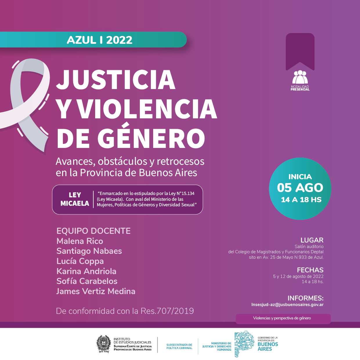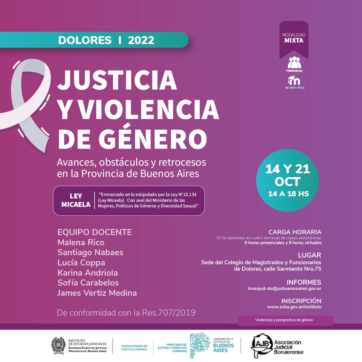 Organizado junto a la Subsecretaria de Política criminal del Ministerio de Justicia y Derechos Humanos de la Provincia de Buenos Aires y el Colegio de Magistrados y Funcionarios de Dolores, de conformidad con la Res.707/2019