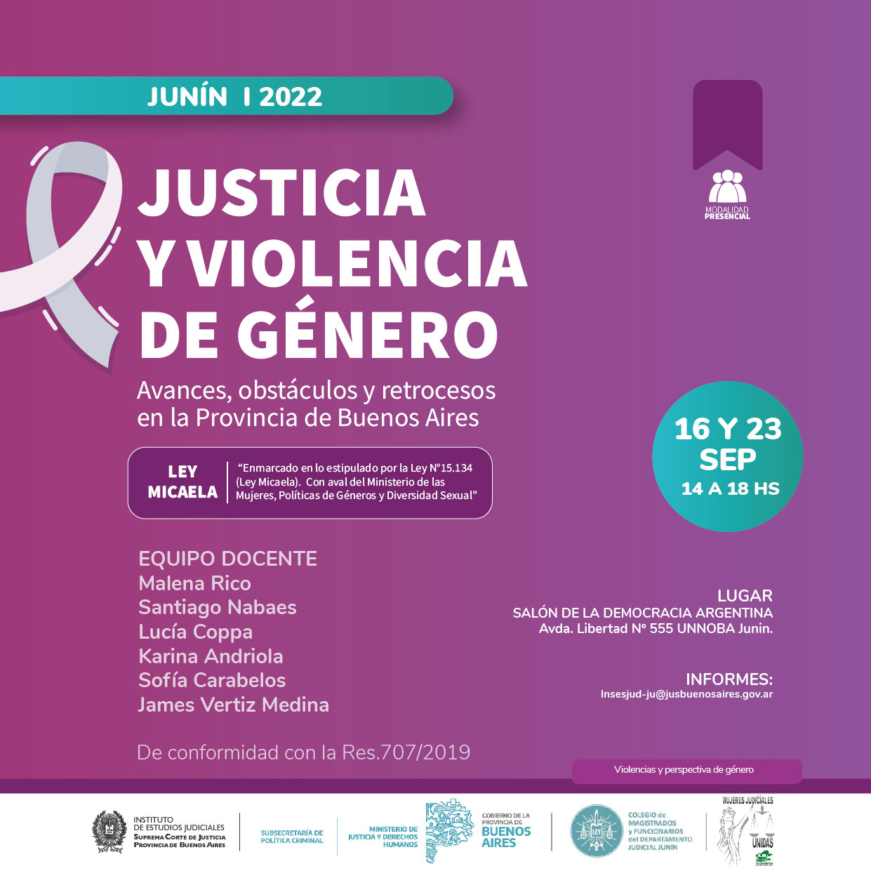 Organizado junto a la Subsecretaria de Política criminal del Ministerio de Justicia y Derechos Humanos de la Provincia de Buenos Aires y el Colegio de Magistrados y Funcionarios de Junin, de conformidad con la Res.707/2019