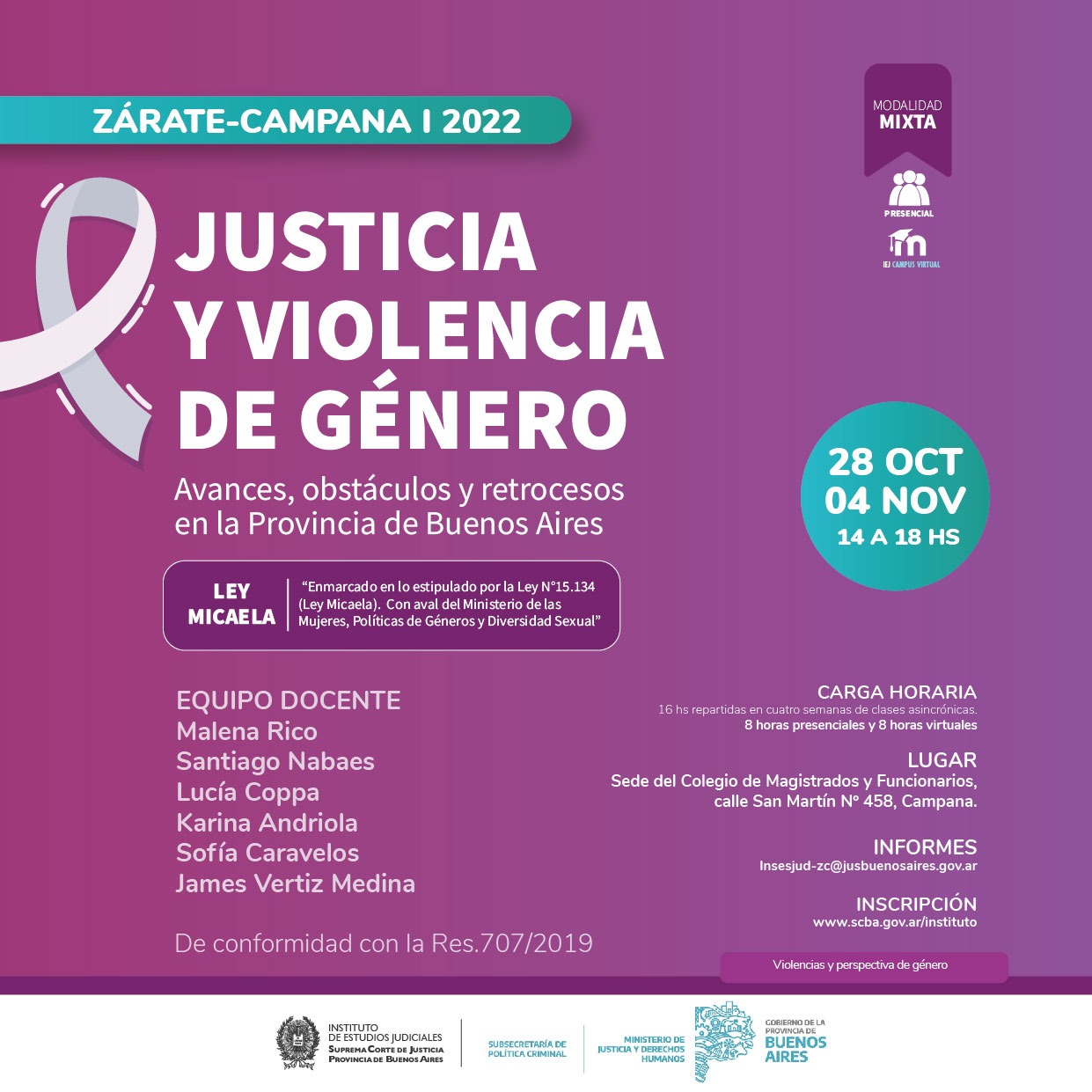 Organizado junto a la Subsecretaria de Política criminal del Ministerio de Justicia y Derechos Humanos de la Provincia de Buenos Aires y el Colegio de Magistrados y Funcionarios de Zárate Campana, de conformidad con la Res.707/2019